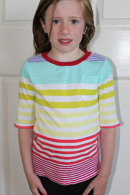 We don't really need long sleeves here in So Cal any more but I figured Rae wanted the sleeve length tested. The fabric is some knit jersey that was only a few dollars for a yard from Joanne's. I don't love the print but paired with the blue bands it is nice looking on her.